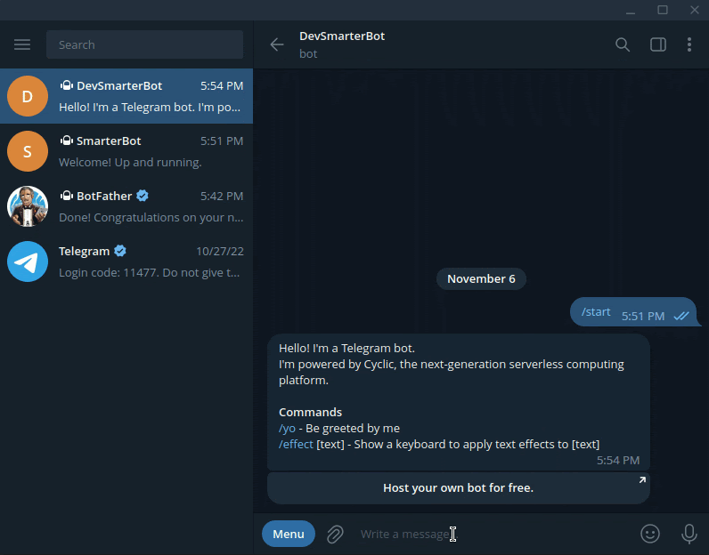 Test it out by sending the /start message to your bot. Note that your program is automatically updated once you modify the bot script.